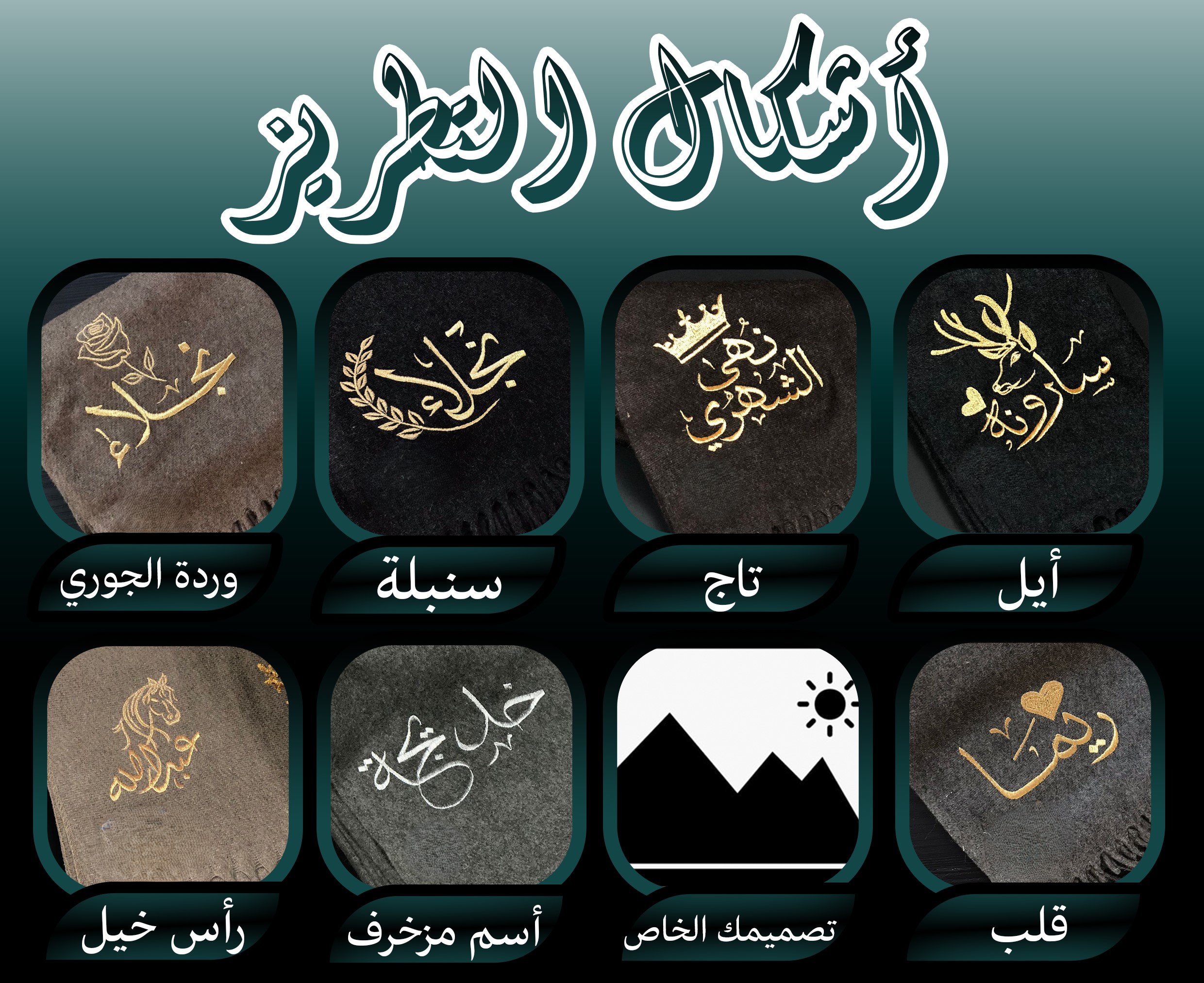 - التصميم: يتميز بتطريز جميل واضافه اسم حسب الطلب لإضافة لمسة عربية أصيلة وأنيقة.